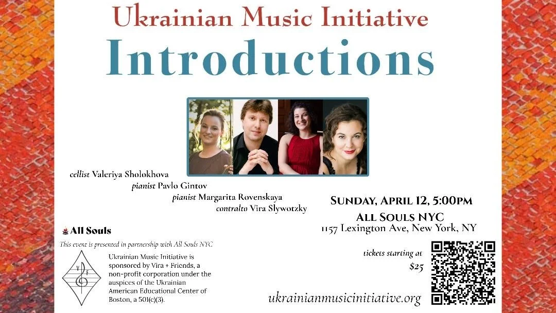 Ukrainian Music Initiative's mission is to elevate Ukrainian classical music to its rightful place in the Western canon through performance and education.INTRODUCTIONS features the musicians of the ensemble - contralto Vira Slywotzky, cellist Valeriya Sholokhova and pianists Pavlo Gintov and Margarita Rovenskaya - performing their favorite chamber works from the Ukrainian classical repertoire. This sampling showcases the breadth of two centuries of composition and includes music by living composers. Enjoy sumptuous, dramatic, tender, moving, poignant, reflective, fun and, always and most importantly, beautiful melodies from Theodore Akimenko, Andrii Didorenko, Mykola Lysenko, Valentin Silvestrov, Ihor Sonevytsky, Yakiv Stepovy, Kyrylo Stetsenko, Stefania Turkewich and Olga Zaitseva-Herz.